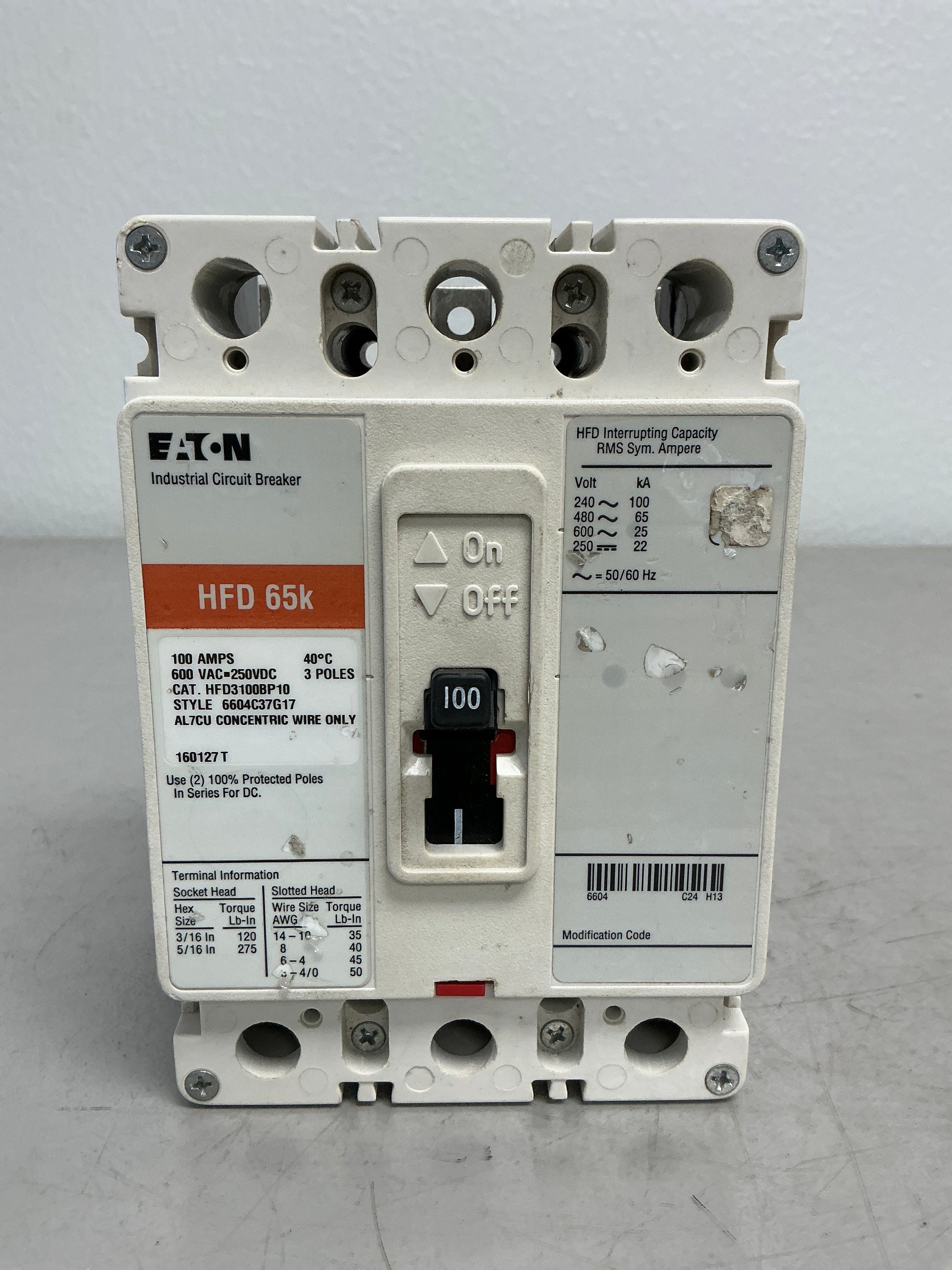 The Eaton HFD3100BP10 is a heavy-duty industrial circuit breaker engineered for demanding three-phase electrical systems. Rated for 100 amps at 600 volts, this 3-pole unit delivers reliable overcurrent protection in commercial and industrial applications. Built to Eaton's exacting standards, it provides dependable performance in power distribution panels and motor control centers. Please note this unit shows cosmetic chipping but remains fully functional. Ideal for facilities requiring robust, proven electrical protection equipment.