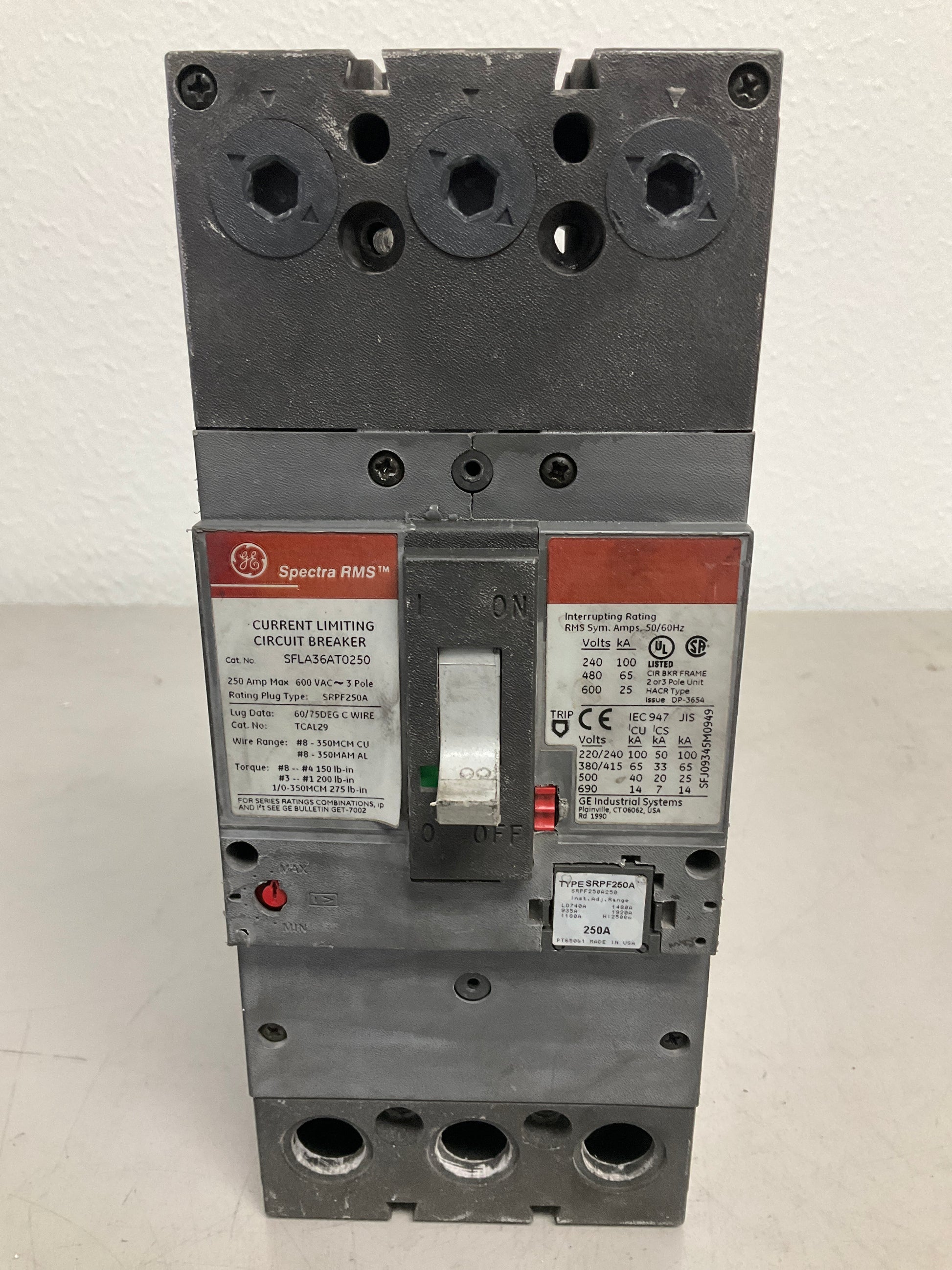 This used SFLA36ATO250 is a 3-pole circuit breaker rated for 250 amps at 600 volts, designed for heavy-duty industrial and commercial electrical applications. The unit shows cosmetic chipping but remains fully functional for panel installations requiring high-capacity protection. Ideal for facilities managing substantial power distribution needs, this breaker delivers reliable overcurrent protection in demanding environments. Verify compatibility with your existing electrical system before installation.