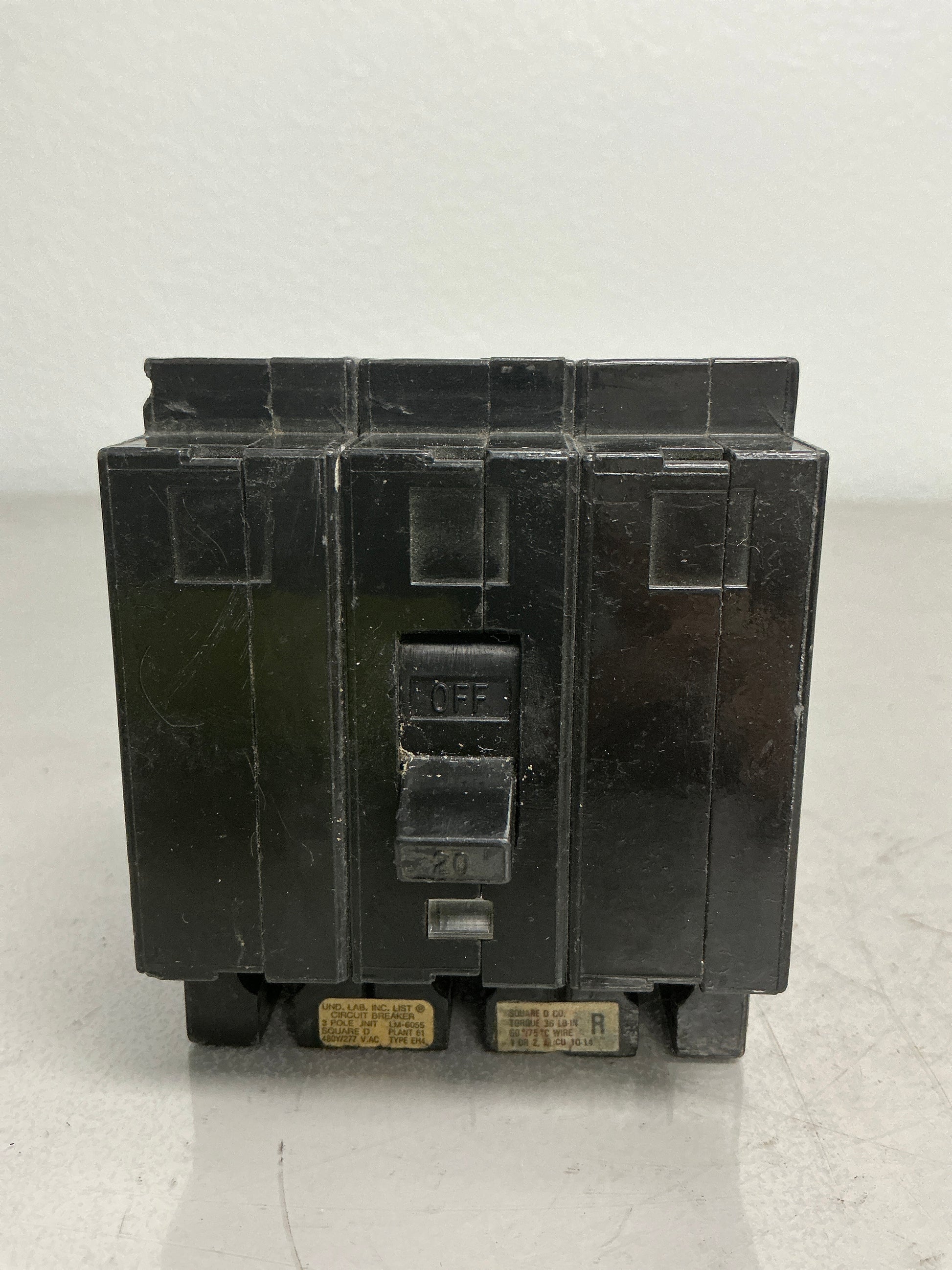 Square D EH34020 three-pole circuit breaker rated for 20 amps at 480 volts. This industrial-grade breaker is designed for heavy-duty electrical distribution applications requiring reliable overcurrent protection in three-phase systems. The unit features Square D's proven engineering and is suitable for panel installations in commercial and industrial settings. Note: This is a used item with cosmetic chipping. Verify compatibility with your specific electrical system before installation.