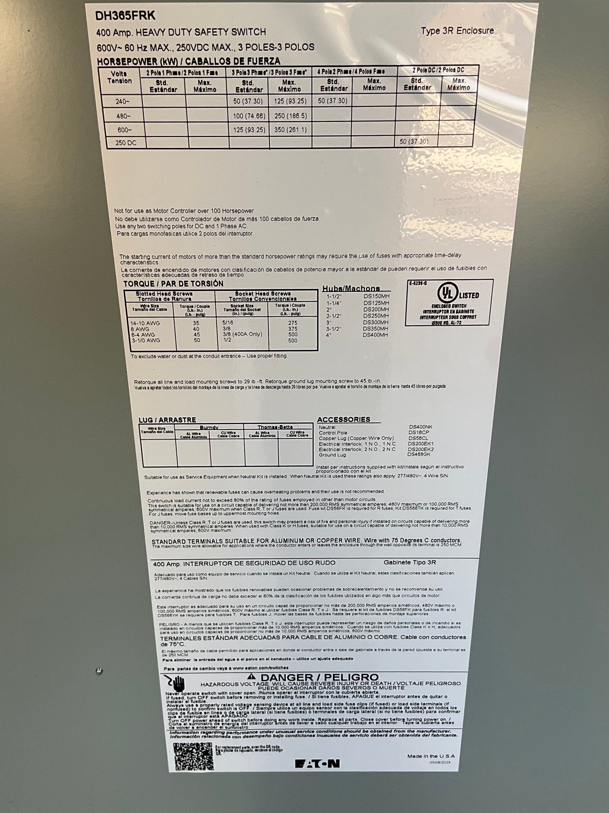 The Cutler-Hammer DH365FRK is a heavy-duty disconnect switch engineered for demanding industrial and commercial applications. Rated for 400 amps at 600 volts, this fusible disconnect provides reliable load isolation and circuit protection in outdoor environments. Built with Cutler-Hammer's proven engineering standards, it delivers dependable performance for three-phase power distribution systems. The robust construction withstands harsh weather conditions while maintaining consistent operation. Ideal for facilities requiring code-compliant disconnection and overcurrent protection in a single, compact unit.