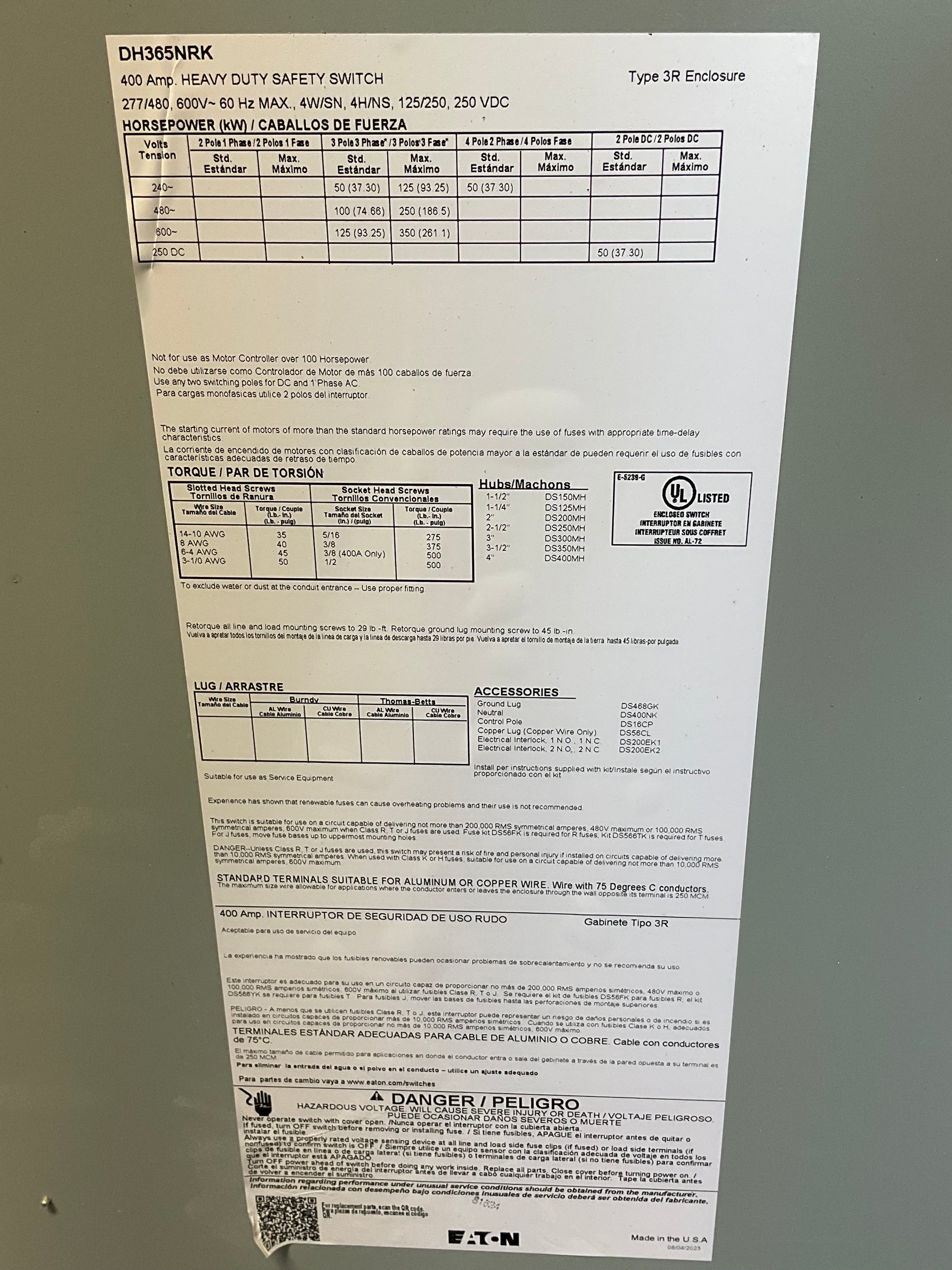 Used Cutler-Hammer DH365NRK Disconnect 400 Amp 600 Volt Fusible Outdoor
