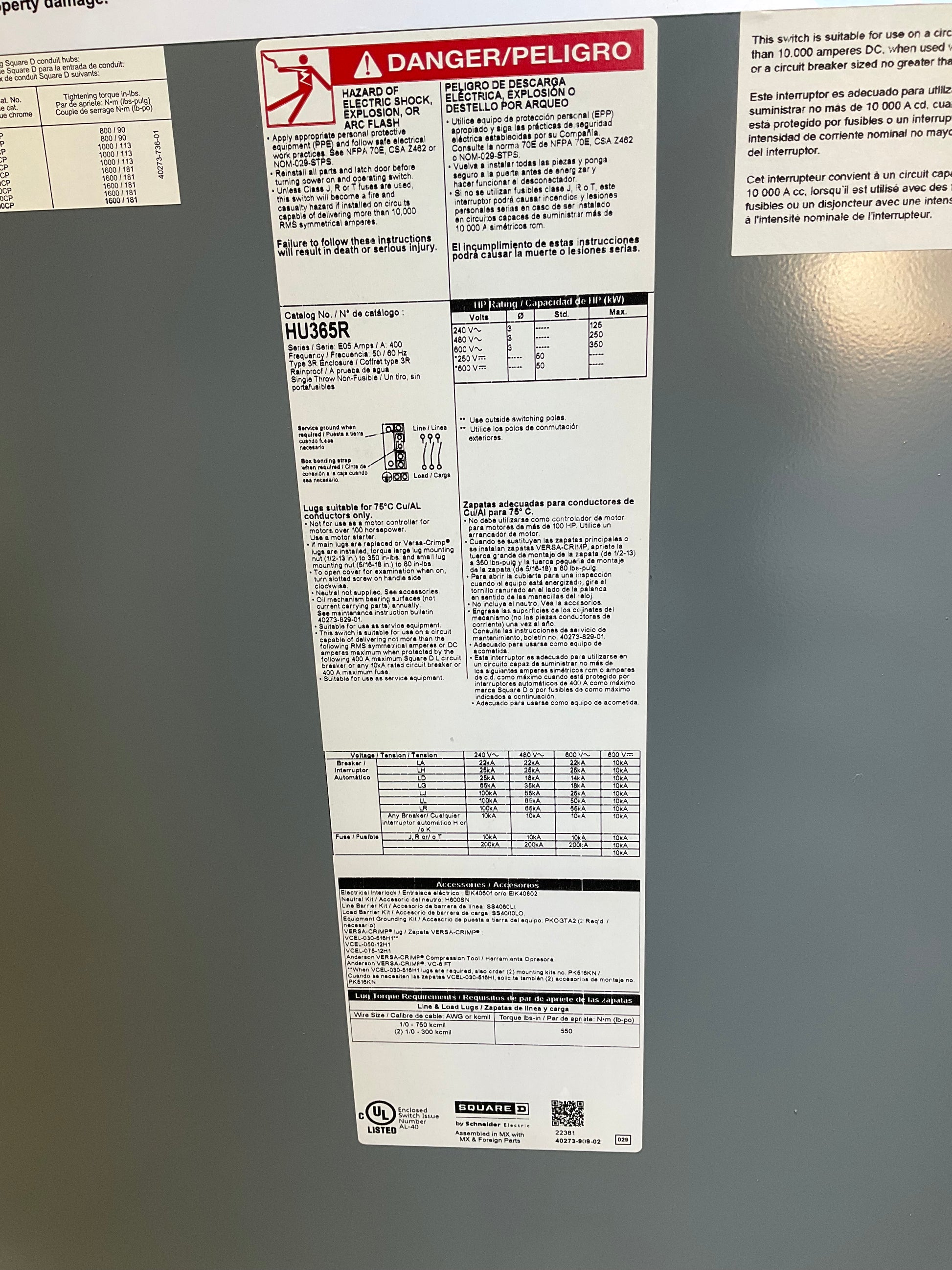 Used Square D HU365R Disconnect 400 Amp 600 Volt Non Fusible Outdoor