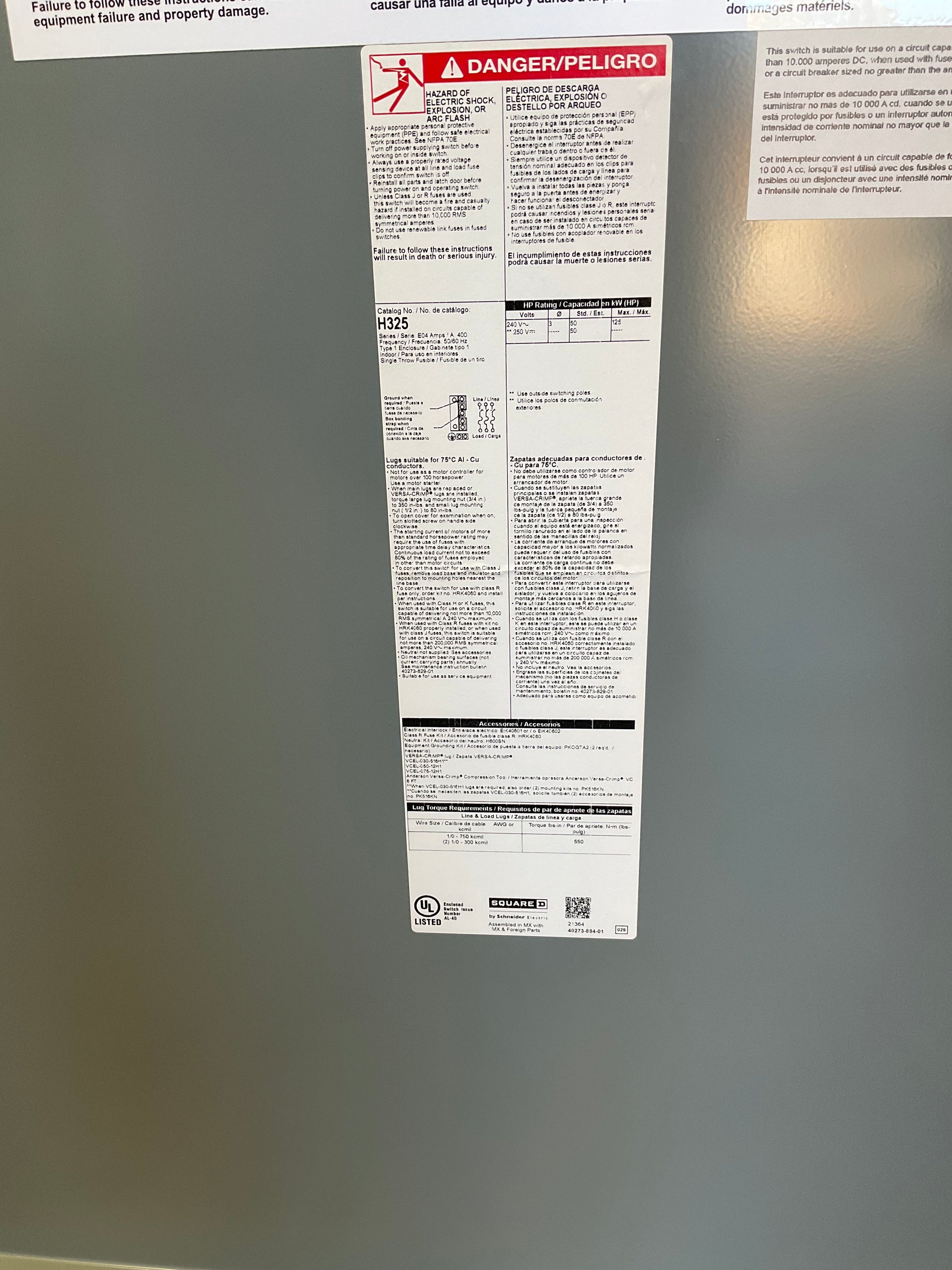 The Square D H325 is a heavy-duty fusible disconnect switch engineered for industrial and commercial applications requiring reliable load isolation. Rated for 400 amps at 240 volts, this indoor-rated unit delivers robust performance in demanding electrical environments. The fusible design provides integrated overcurrent protection, eliminating the need for separate fusing components. Built with Square D's proven engineering standards, it ensures safe equipment disconnection and maintenance access. Ideal for motor control centers, machinery installations, and panel applications where code-compliant, dependable switching is essential.