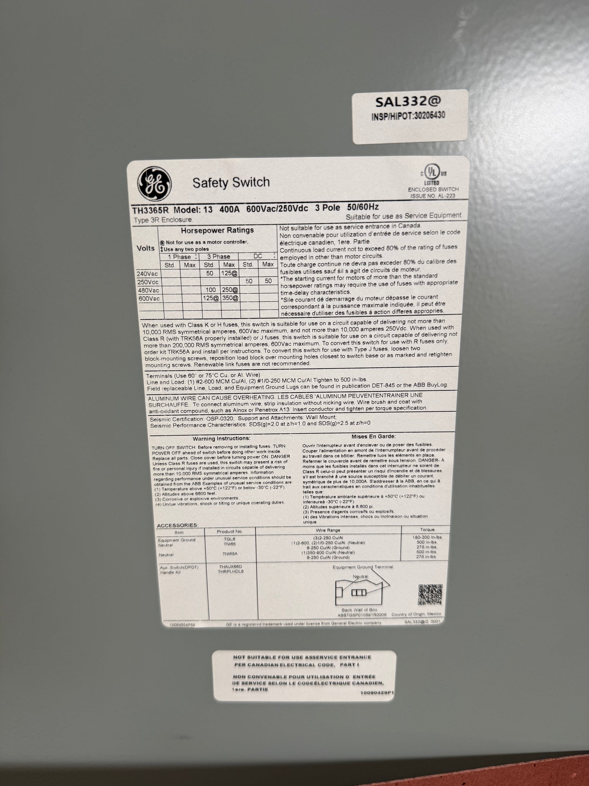 The TH3365R is a three-pole disconnect switch rated for 400 amperes at 600 volts, designed for industrial and commercial electrical installations. This heavy-duty component provides manual isolation capability for high-amperage circuits, enabling safe equipment maintenance and emergency shutdown operations. Built to withstand demanding electrical environments, it delivers reliable switching performance and arc suppression. The TH3365R is essential for applications requiring positive disconnection of substantial power loads while maintaining code compliance and operational safety.