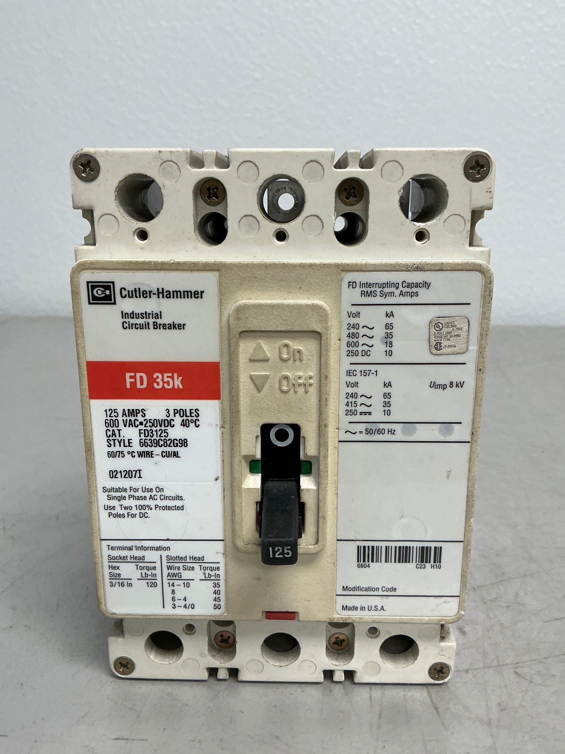 Used FD3125 circuit breaker rated for 125 amps at 600 volts with 3-pole design. This heavy-capacity breaker handles substantial electrical loads in industrial and commercial power distribution systems. The FD3125 delivers consistent overcurrent protection for demanding applications requiring higher amperage ratings. An economical option for upgrading or replacing protection devices in three-phase electrical installations.