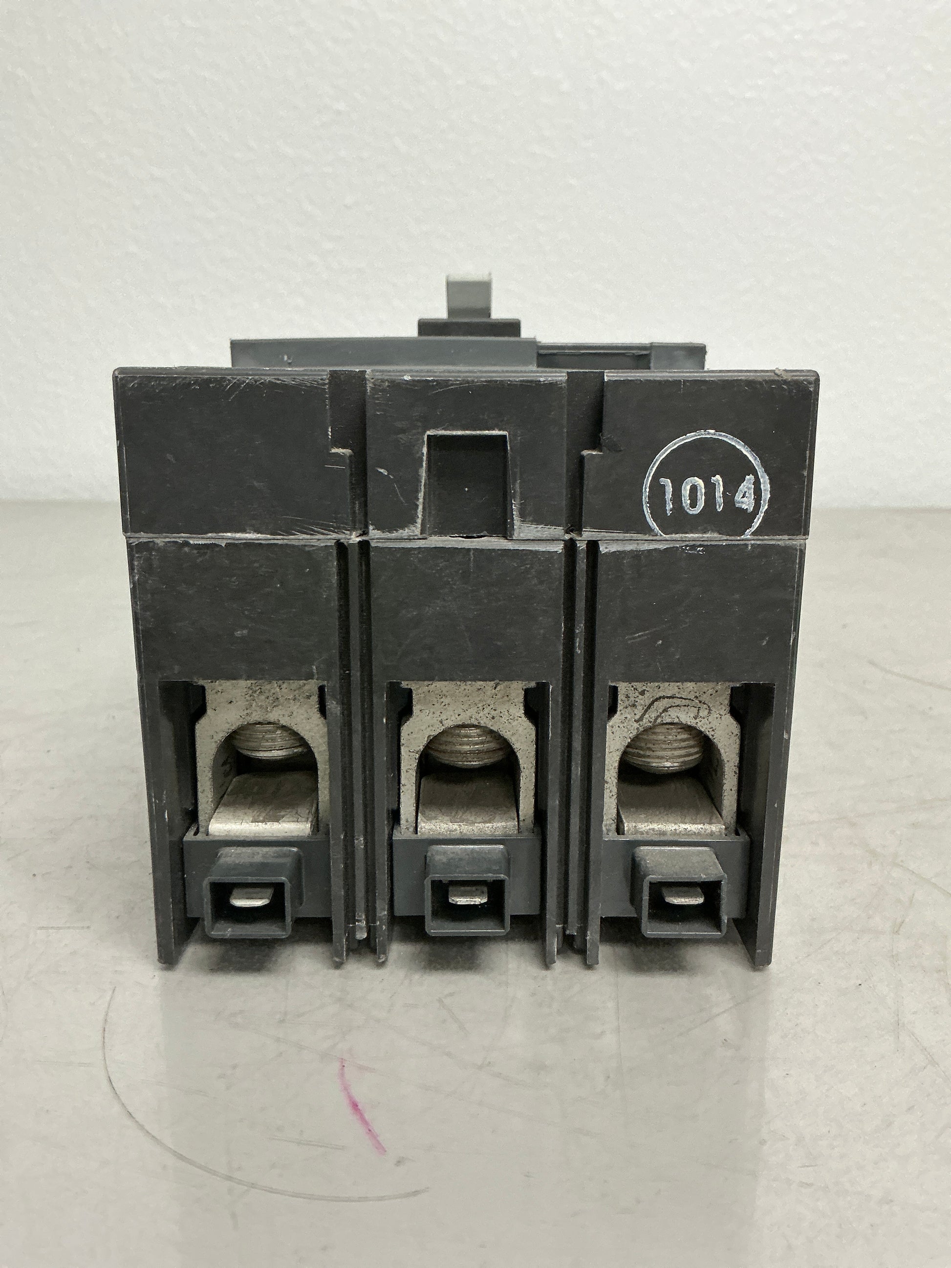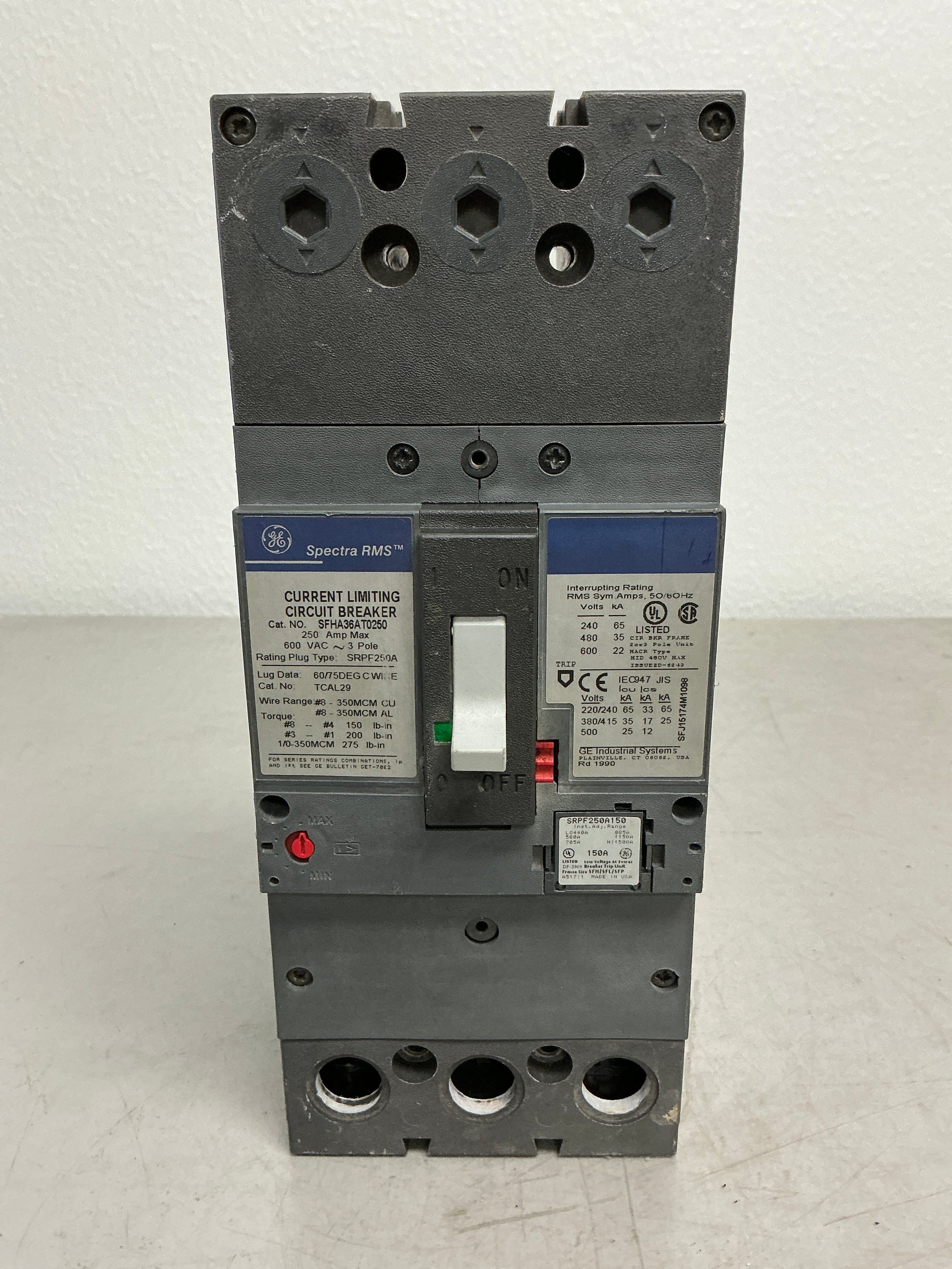 SFHA36AT0250 three-pole circuit breaker rated for 250 amperes at 600 volts. This used unit features a chipped condition and is designed for high-capacity three-phase power applications in industrial and commercial settings. Suitable for main distribution panels and heavy-load equipment protection. The 250-amp rating handles substantial electrical demands. Inspect the chipped area before installation to ensure it does not affect operational safety or performance. Sold as-is with noted cosmetic damage.