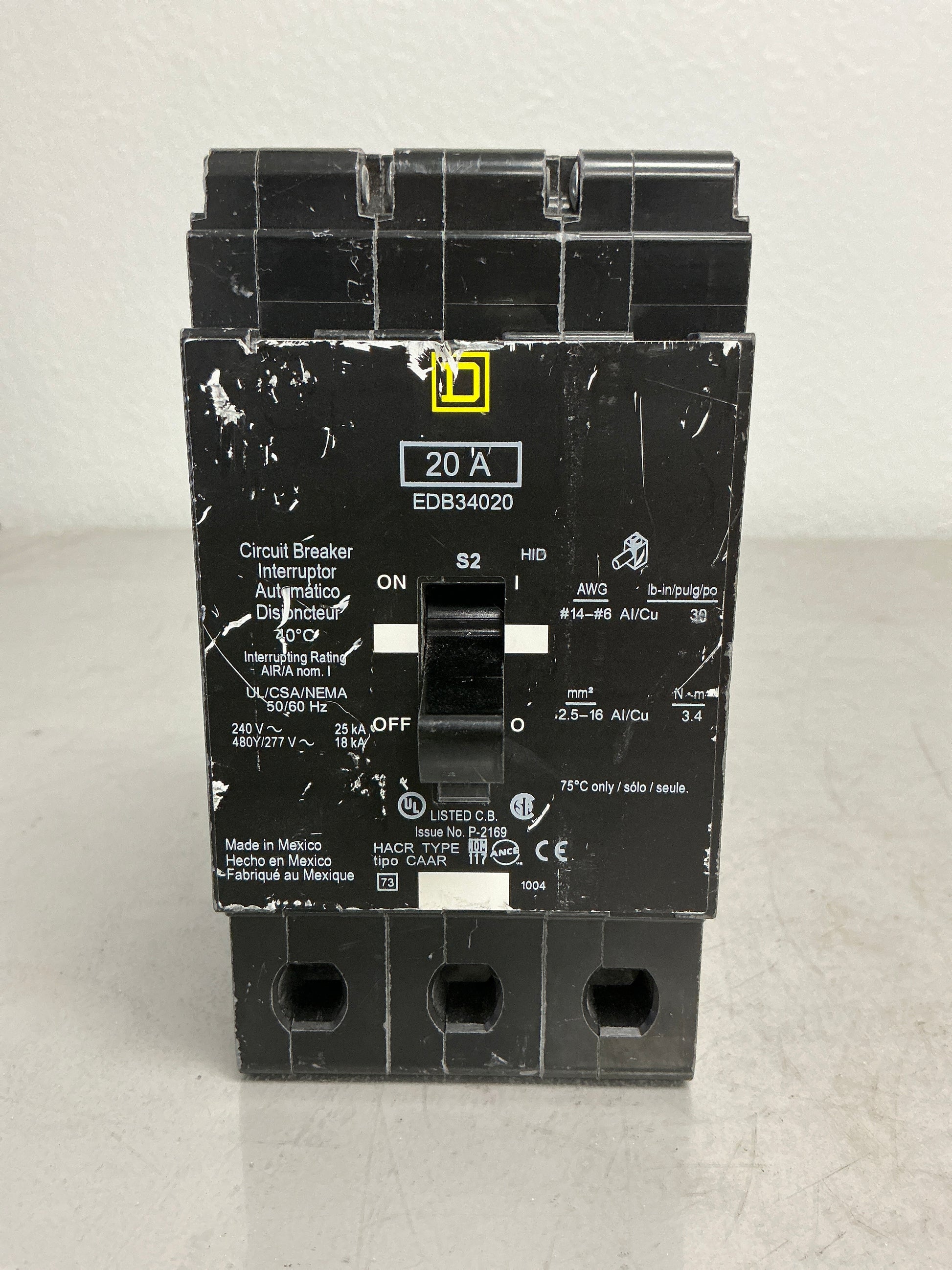 Used Square D EDB34020 3 Pole, 20 Amps, 480 Volts