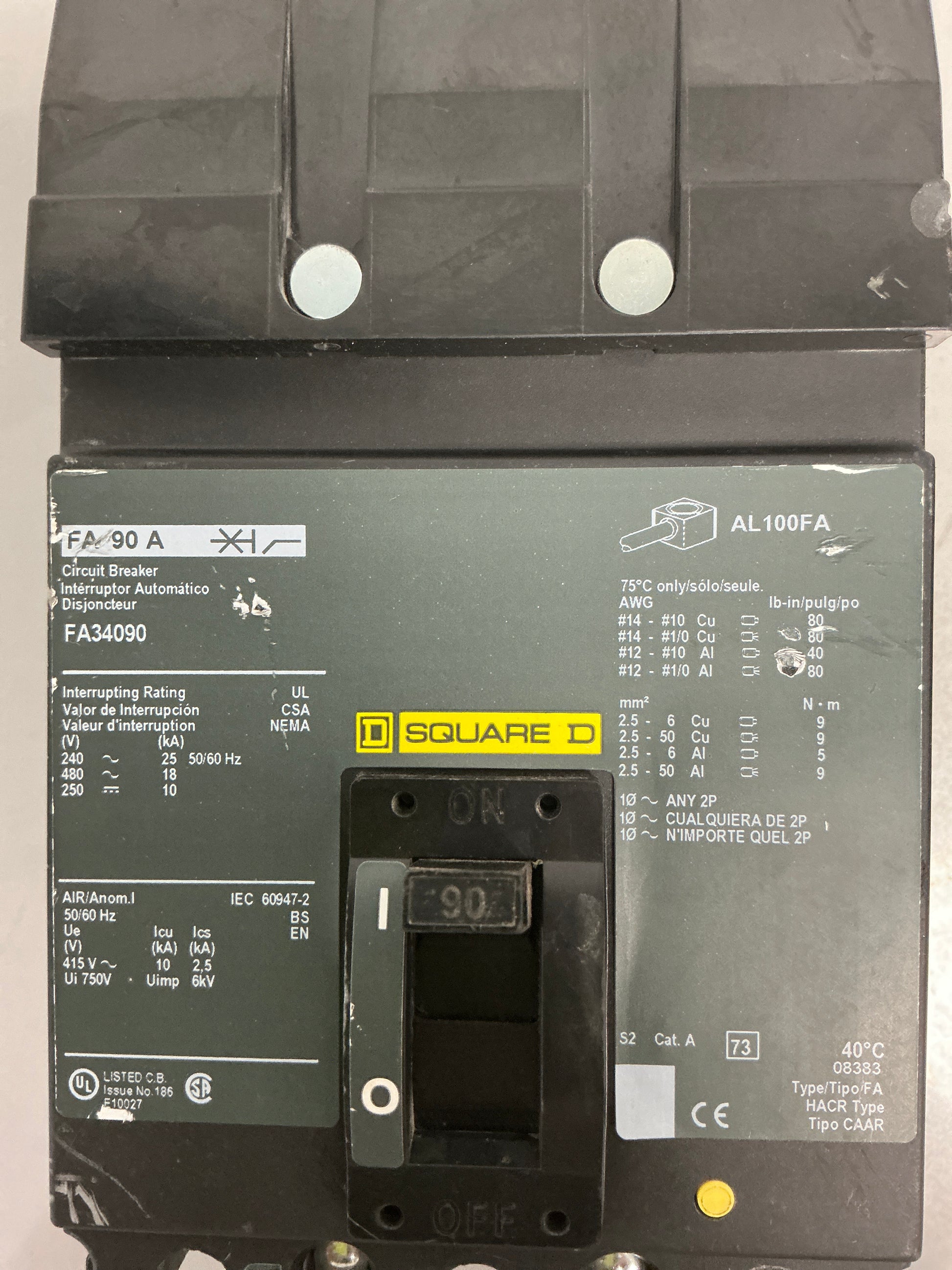 Used Square D FA34090 3 Pole, 90 Amps, 480 Volts